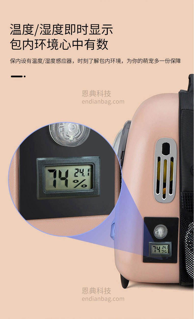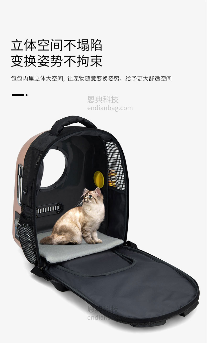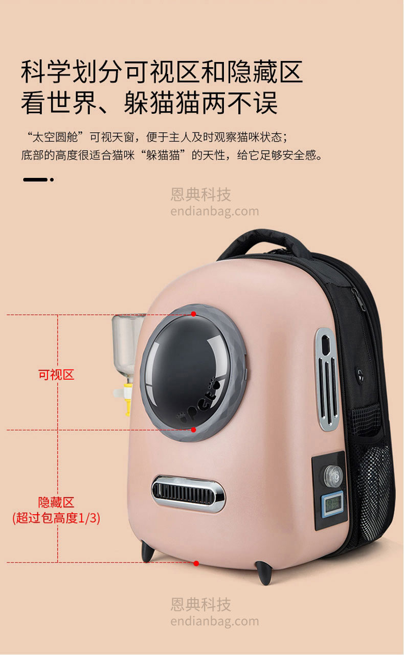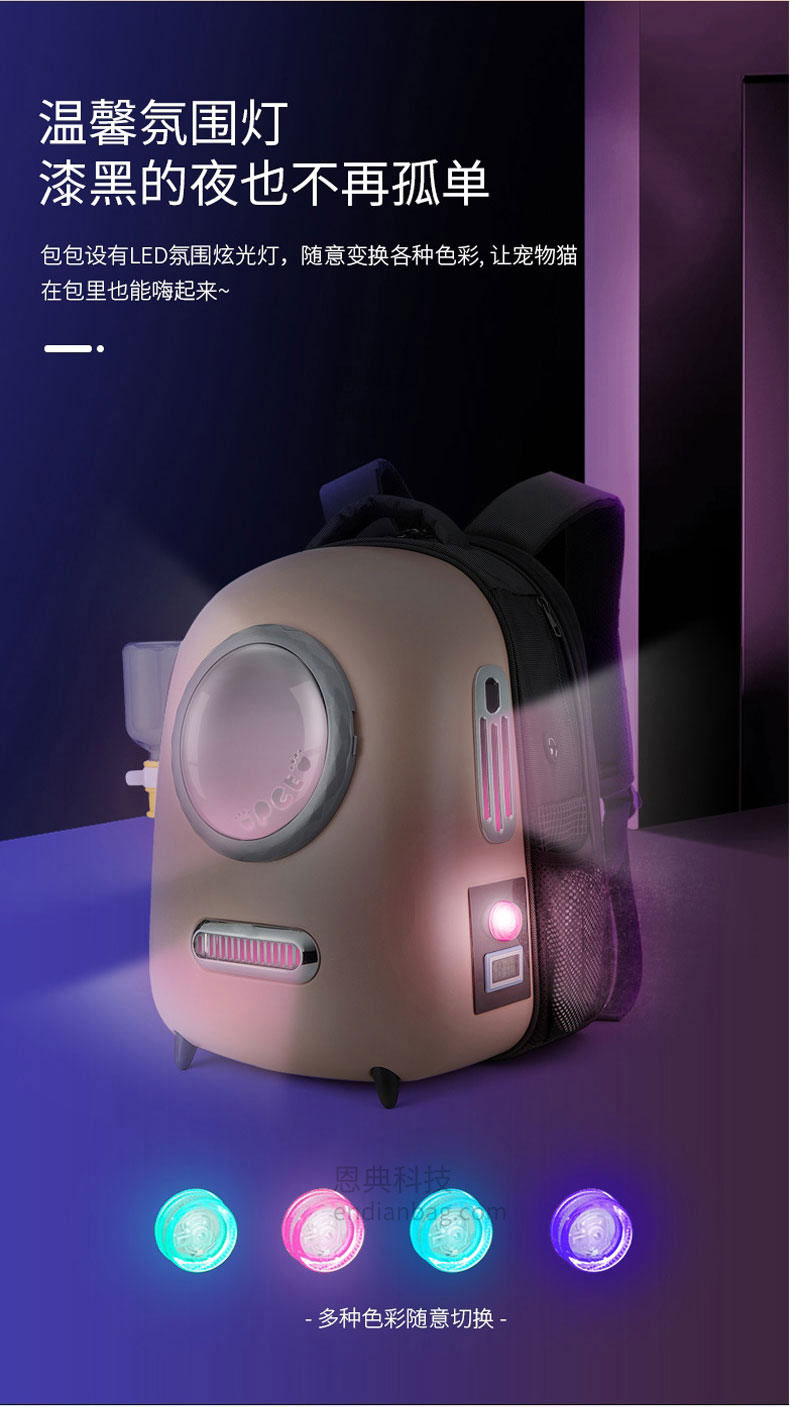 智能太空宠物包定制三面进气格栅设计,环绕式通风。包内设有温度/湿度感应器,时刻了解包内环境。包包设有LED氛围炫光灯,随意变换各种色彩。包包内里立体大空间,宠物可随意变换姿势。减震背板,科技新型材质背带,均匀分散受力减轻背负压力,中空网孔结构。宠物包定制请认准东升国际科技背包厂家。东升国际科技是一家拥有25年背包定制经验的箱包厂家,自建15000㎡工业园、16条智能生产线、32人设计研发团队,合作伙伴有新秀丽、阿里巴巴等企业。所以,东升国际科技是您值得信赖、值得选择的背包厂家。