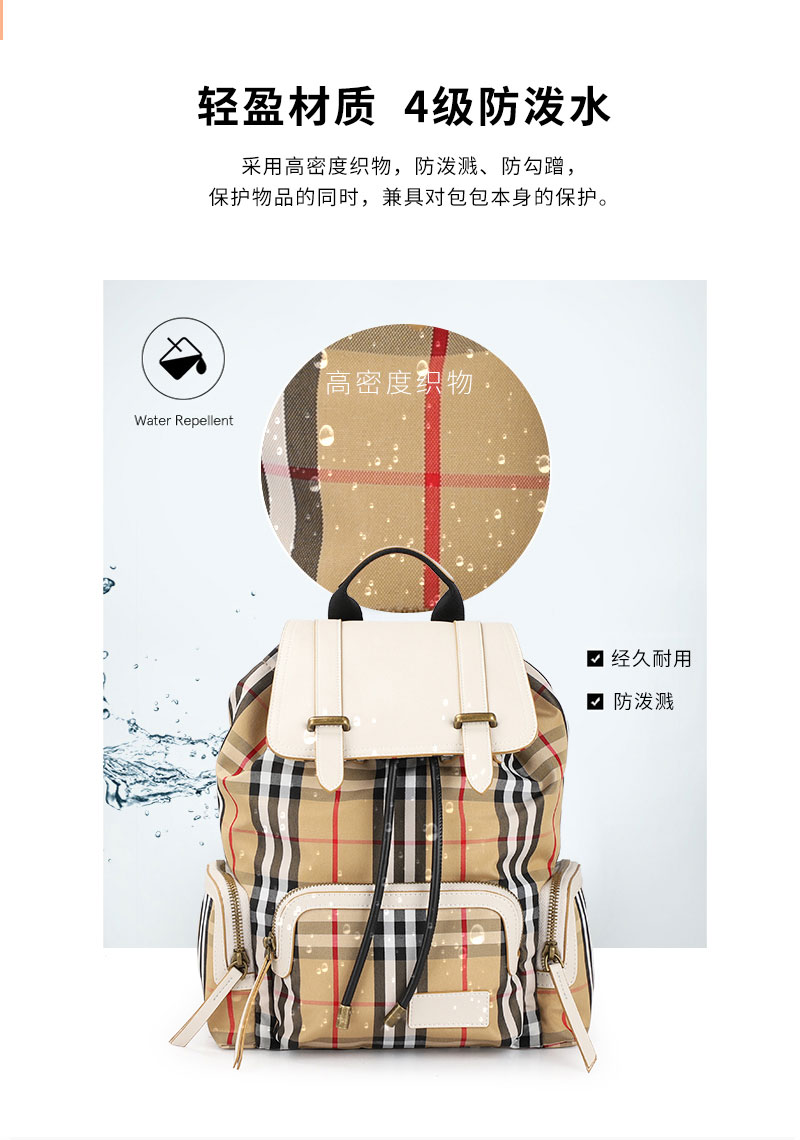 采用高密度织物,轻盈材质,4级防泼水,防泼溅,防勾蹭;